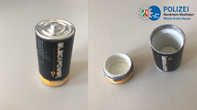Als der Beamte die vermeintliche Batterie näher inspizierte, fiel ihm ein Drehverschluss auf. Im Inneren der Batterie befand sich ein weißes Pulver, bei dem es sich vermutlich um Amphetamine handelt.