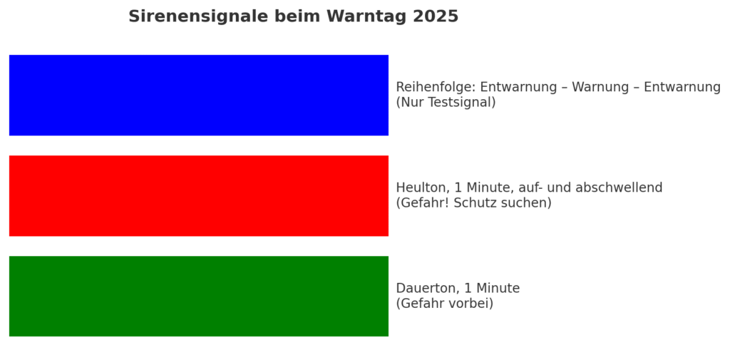 | Alarmprobe | Reihenfolge: Entwarnung – Warnung – Entwarnung | Nur Testsignal, keine Gefahr |
