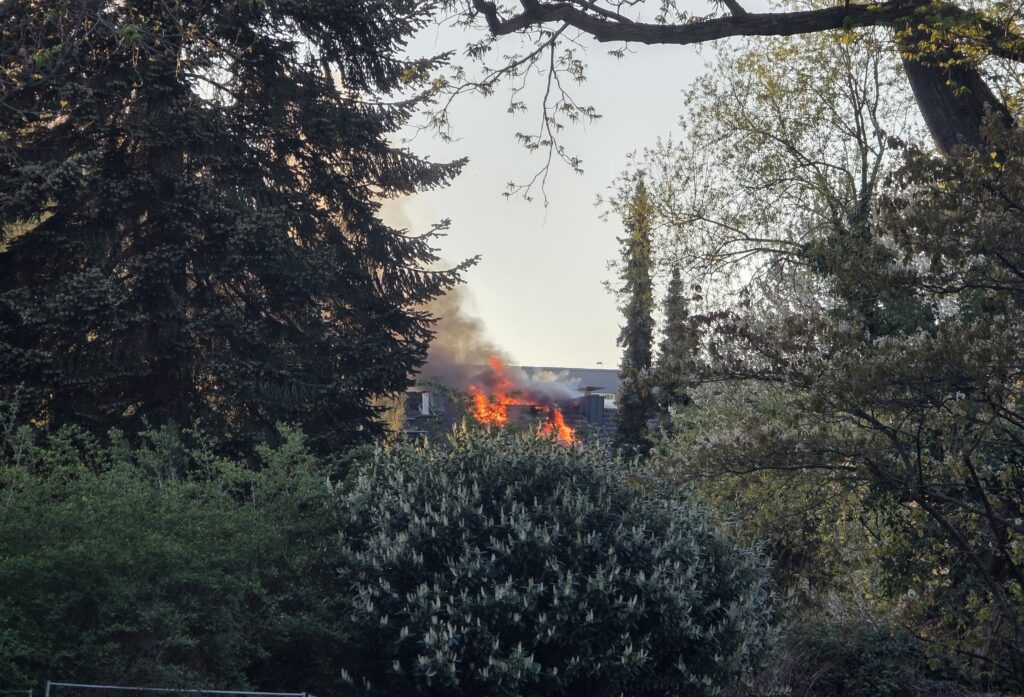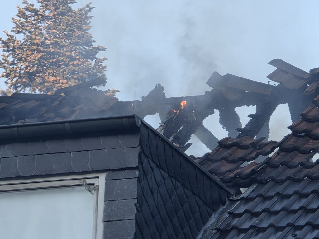 Beim Eintreffen der ersten Einsatzkräfte bestätigte sich die Lage: Dichter Rauch und offener Flammenschein waren im Bereich des Dachstuhls sichtbar. Da sich zunächst noch Personen im Gebäude befinden sollten, wurden umgehend weitere Kräfte nachalarmiert, darunter auch zwei Drehleitern.