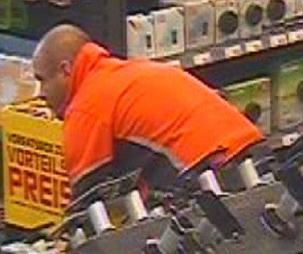 Die Polizei fragt: Wer kennt die abgebildete Person? Wer kann Angaben zu der auffälligen, orange-schwarzen (Arbeits-)Bekleidung machen? Hinweise an die Kriminalpolizei unter der Rufnummer 02161-290.