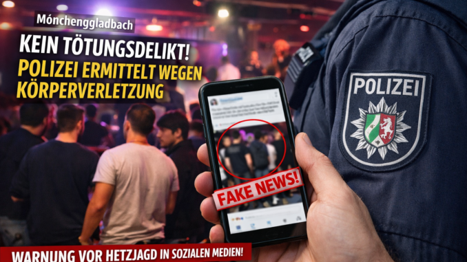 Die Polizei Mönchengladbach stellte auf Anfrage klar, dass es zwar einen Einsatz in der betreffenden Diskothek gegeben habe, aktuell jedoch ausschließlich wegen Körperverletzung ermittelt werde. Hinweise auf ein Tötungsdelikt lägen nicht vor.