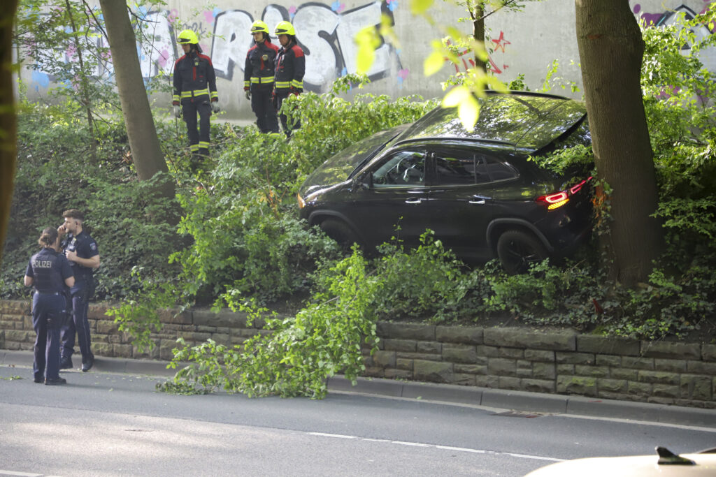 Der Wagen kam von der Fahrbahn ab, rutschte in die Böschung und kam glücklicherweise zwischen zwei Bäumen zum stehen. Glück im Unglück hatten dabei vor allem die Fahrzeuge auf der daneben liegenden Hermann-Piecq-Anlage, ohne die Bäume wäre der Wagen auf die zu diesem Zeitpunkt stark befahrene Straße gestürzt.