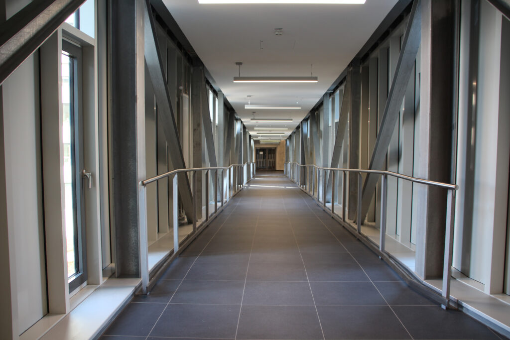 Das Gebäude an der Völklinger Straße wurde vom Bau- und Liegenschaftsbetrieb Nordrhein-Westfalen (BLB NRW) vollständig revitalisiert. Ziel war es, moderne Arbeitsplätze zu schaffen und gleichzeitig bestehende Ressourcen nachhaltig zu nutzen. Rund 440 Beschäftigte kehren nun an den zentralen Standort zurück, der durch eine neu errichtete Verbindungsbrücke direkt mit dem Hauptgebäude verbunden ist.
