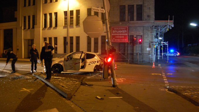 Ein 20-jähriger Peugeot Fahrer befuhr die Wickrathahner Straße in Richtung Wickrathberger Straße. An der Kreuzung zur Beckrather Straße zeigte die Ampel Rotlicht. Der Mann fuhr über die rote Ampel in den Kreuzungsbereich ein. Dort kam es zu einem Zusammenstoß mit einem 38-jährigen eines Mercedes Fahrer, der die Beckrather Straße in Richtung Kirchstraße befuhr. Bei dem Aufprall, riss das linke Hinterrad ab und schleuderte 20 Meter weit. Der 20-jährige wurde bei dem Unfall schwer verletzt und verbleibt derzeit stationär in einem Krankenhaus. An beiden Fahrzeugen entstand Totalschaden. Auch die Ampelanlage wurde erheblich in Mitleidenschaft gezogen.