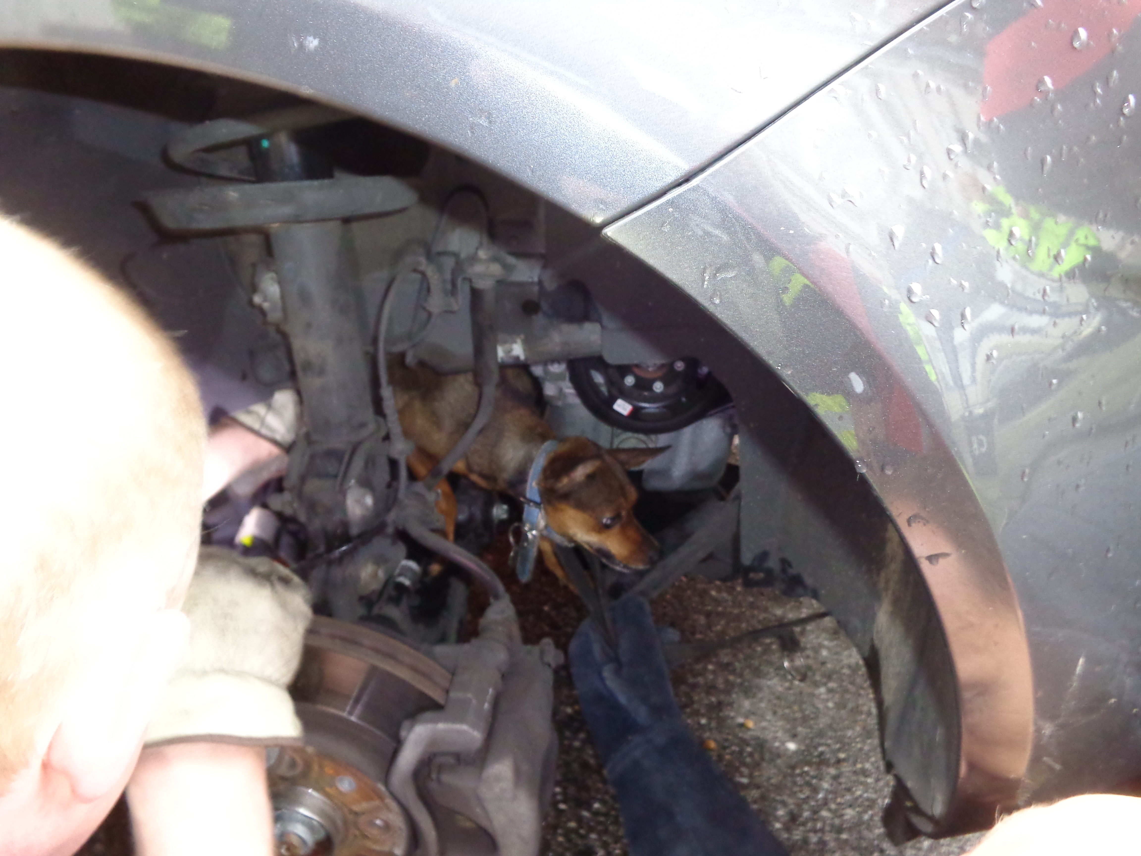 Den eingesetzten Polizeikräften gelang es zunächst nicht, den Hund, der sich hinter einen Querlenker gezwängt hatte, zu befreien. Sie forderten daher die Feuerwehr an. Der gelang es schließlich, den Kleinen aus seiner misslichen Lage zu befreien.