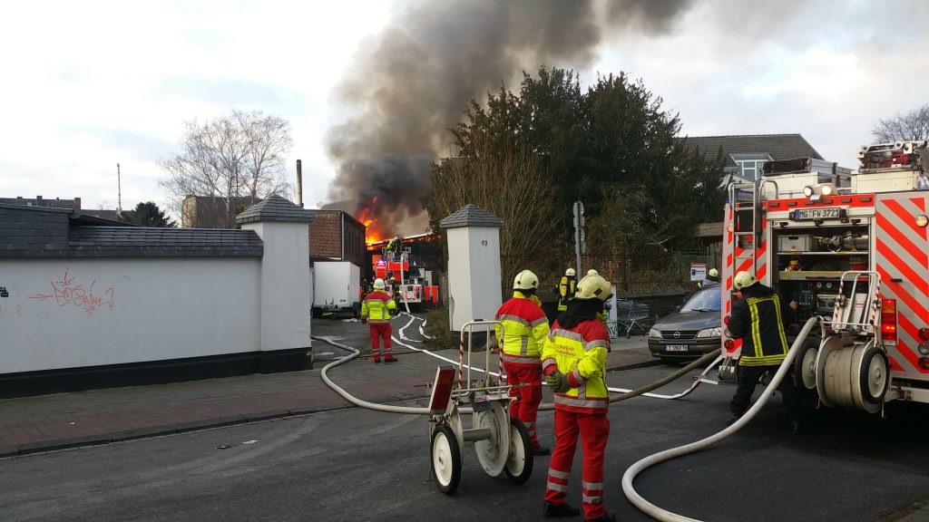 An Silvester meldeten sich gegen 14:50 Uhr zahlreiche Anrufer bei der Mönchengladbacher Feuerwehr. Auf der Alsstraße ist es in einer Schreinerei zu einer Verpuffung gekommen. Wenige Sekunden später stand der gesamte Betrieb bereits in Vollbrand. Die Rauchsäule war in weiten Teilen von Mönchengladbach sichtbar. Die Ersteintreffenden Kräfte konnten durch einen gezielten Wassereinsatz ein übergreifen auf Nachbargebäude verhindern. Mithilfe von zwei Drehleitern wurde ein flächendeckender Wasserangriff vorgenommen. Zeitgleich waren mehrere Trupps unter Pressluftatmern mit C-Rohren im innen und Außenangriff tätig.