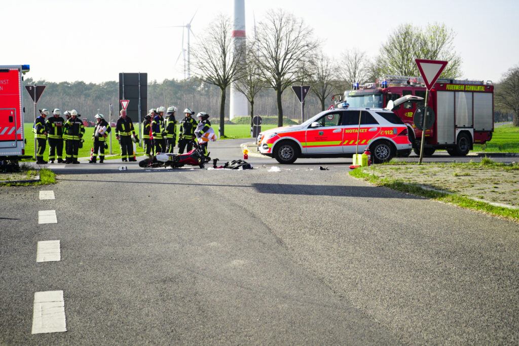 Im Kreuzungsbereich kam es zum Zusammenstoß. Die Autofahrerin wurde dabei nicht verletzt. Den Motorradfahrer brachte ein Rettungshubschrauber in eine Klinik.