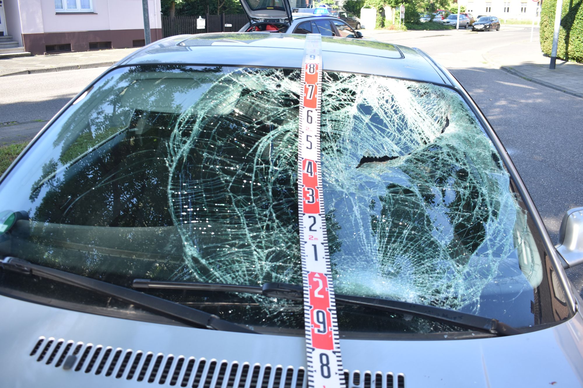 Durch den Aufprall von Kopf und Körper beschädigte Windschutzscheibe