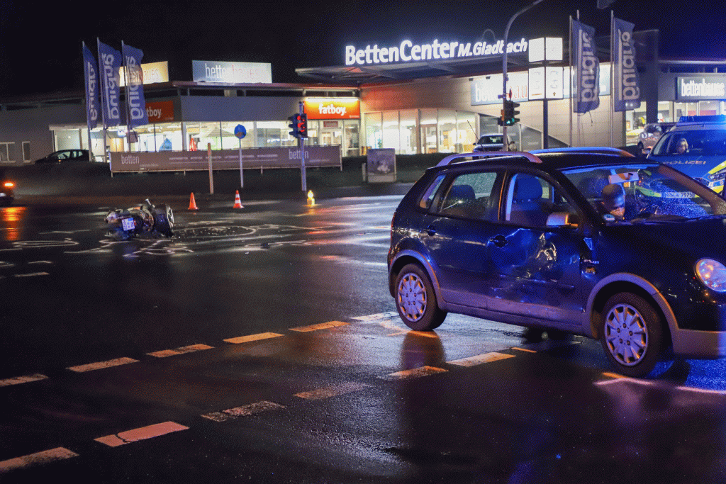 Mönchengladbach. Am Donnerstagabend gegen 17.30 Uhr ereignete sich auf der Kreuzung Krefelder Straße Ecke Nordring ein schwerer Verkehrsunfall. Im Kreuzungsbereich stießen ein Roller und ein Pkw zusammen. Der 44-jährige Rollerfahrer zog sich dabei so schwere Verletzungen zu, dass er zunächst in Lebensgefahr schwebte.