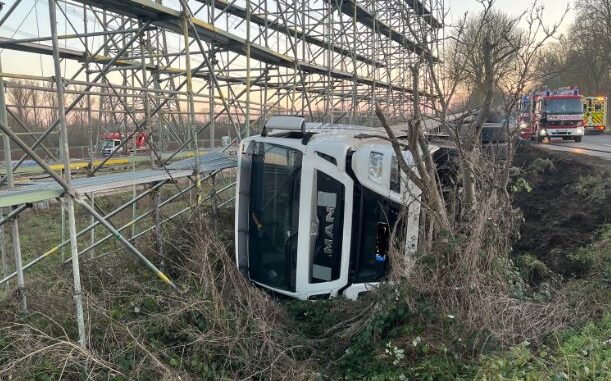 Die Ladung des LKW bestand aus 10 Tonnen Heu. In Höhe des Erprather Weg musste der Fahrer nach eigenen Angaben einem Tier ausweichen. Hierdurch geriet er nach rechts in den Grünstreifen, woraufhin der LKW zur Seite kippte. Hierbei prallt der LKW gegen ein Gerüst, welches im Rahmen des Neubaus der Stromtrasse aufgebaut ist.