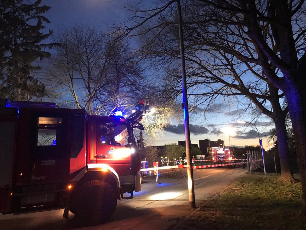 Die Feuerwehr musste eingreifen und die Mülforter Straße für rund drei Stunden vollständig sperren. Mit Hilfe einer Drehleiter wurde der Baum im oberen Bereich freigeschnitten und der restliche Stamm im Anschluss kontrolliert gefällt.
