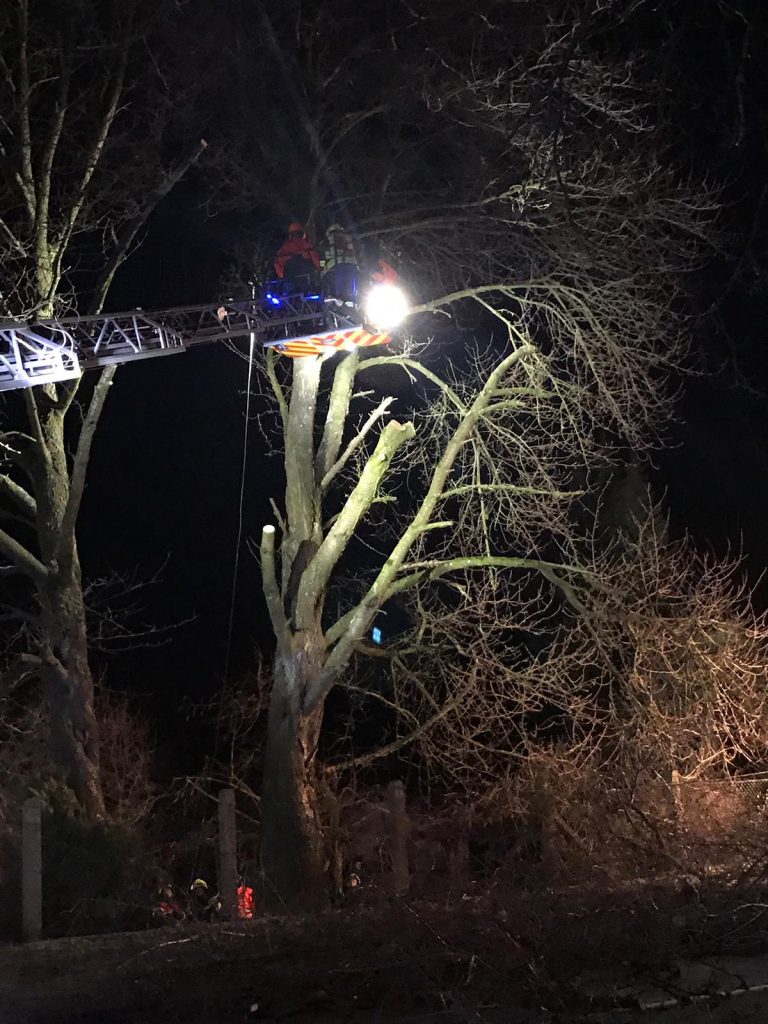 Im unteren Bereich des Baumes war am Nachmittag ein größerer Ast abgebrochen. Bei näherer Betrachtung stellte sich heraus, dass der Baum von innen bereits teilweise hohl war. Dadurch war bereits ein großer Teil des Querschnittes verloren gegangen. Durch die weiter anhaltenden Windböen geriet der Baum in Schieflage und drohte auf die stark befahrene Mülforter Straße zu fallen.