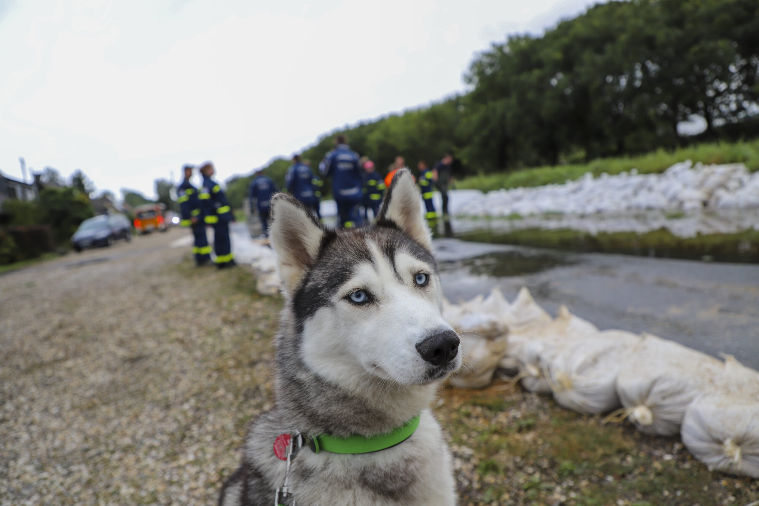 Ein Malamut begutachtet die Tätigkeiten an der Neuen Niers
