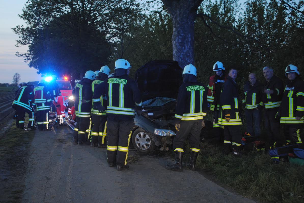 Am Sonntag. 01.05., gegen 20.40 Uhr befuhr ein mit fünf Personen besetztes Fahrzeug einen Feldweg im Bereich “Happelter Heide”. Nach ersten Erkenntnissen vermutlich unter Alkoholeinfluss stehend und zudem zu schnell fahrend verlor der Fahrer die Kontrolle über das Fahrzeug, worauf die Fahrt an einem Baum endete.