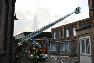 Am Sonntagnachmittag gegen 17.45 Uhr entdeckten Mitarbeiter der Kreis-Leitstelle eine Rauchsäule über dem Gelände. Eine erste Erkundung ergab sehr schnell, dass es wieder in demselben Bereich brannte wie im Februar – im ersten Obergeschoss. Dort waren Akten gelagert. Denn als die Firma, die hier bis Ende 2014 Heizungsanlagen hergestellt hatte, das Areal verlassen hatte, war ein großer Teil des Inventars zurück geblieben. Nachbarn hatten damals berichtet, hier seien häufiger „wilde Partys“ gefeiert worden. Der Einsatz im Februar war auch nicht der erste an dieser Adresse gewesen. Immer wieder hatte es auch vorher – allerdings kleinere – Brände gegeben, zuletzt im November 2016.